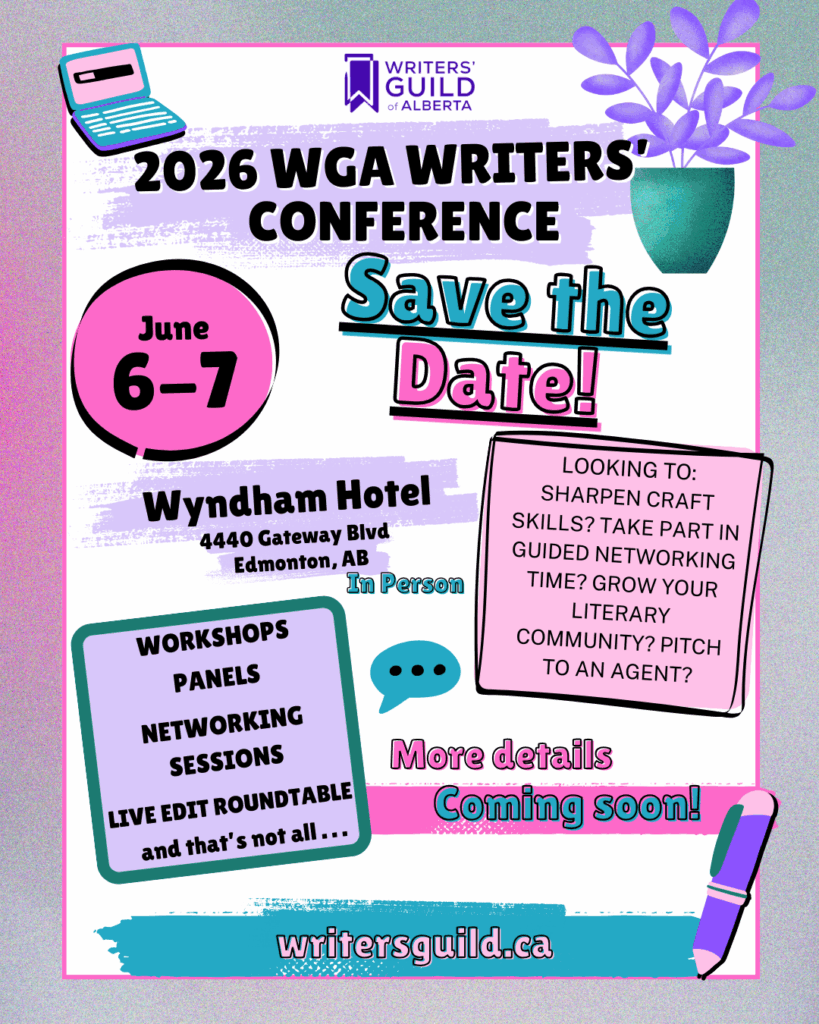 The Writers’ Guild of Alberta’s 2026 Spring Conference: Growing Craft & Community will focus on craft insight, tools to help your literary practice and advice on the business of writing, with a special focus on guided networking time to help you build your literary community. The conference will have programming for all writers, emerging to established (and everyone in between), aiming to bring writers together from all over the province.