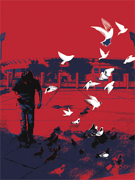 This illustration is one of eight that forms part of a larger body of work created over the span of a decade. The series is based on her father’s recorded personal account of his experiences during the 1973 Chilean military coup. Together, the works comprise screen prints, transparencies and a hand-bound book. The visual is inspired by the Chilean political graphic style that was outlawed by the Pinochet dictatorship and disappeared amid the “national forgetting” perpetuated by later democratic governments.