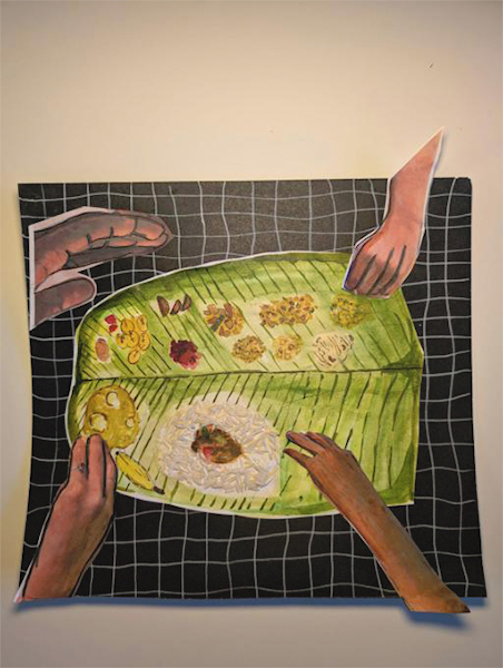 All Hands on Deck celebrates the tradition of eating together with our hands, inspired by the South Indian sadya, a meal served on a banana leaf. For me, this practice is about more than food — it’s about closeness, care and community. By highlighting the act of eating without cutlery, a practice often misunderstood or overlooked, this work challenges colonial ideas of etiquette and uplifts traditions rooted in connection, care and community.